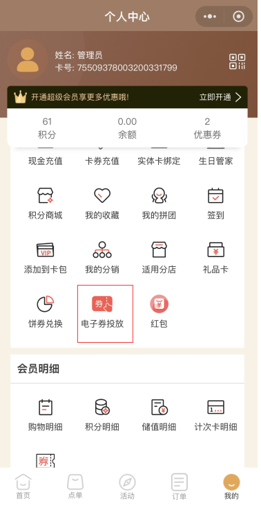 3.1添加管理员手机号后,对应手机号小程序个人中心显示电子券投放按钮
