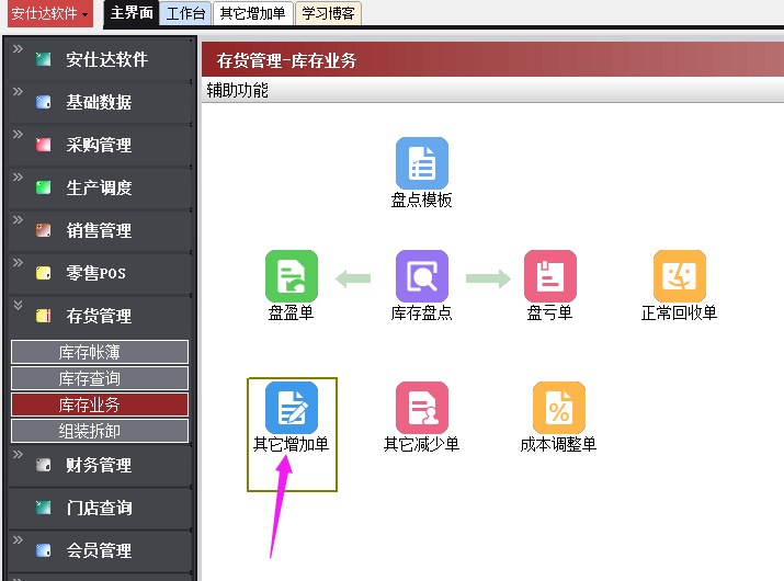 存货管理->库存业务->其他增加单