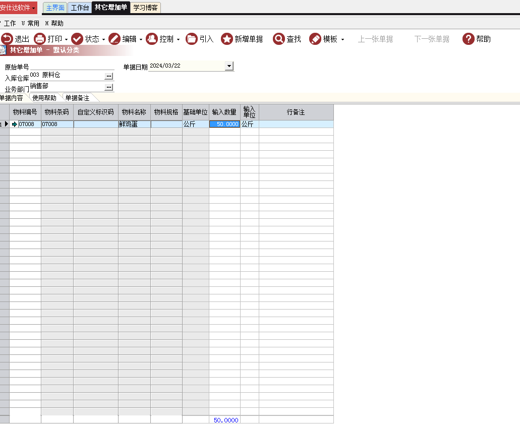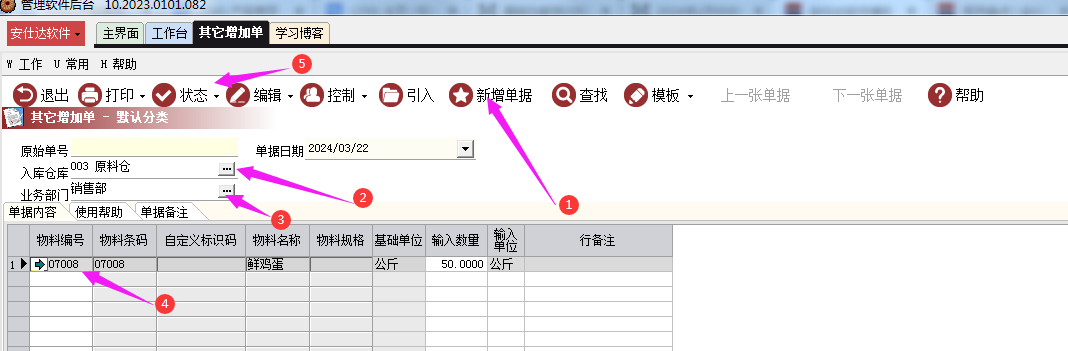打开其他增加单后,点击新增单据,选择入库仓库、业务部门,然后输入需要增加库存的产品,按向下方向键可以继续增加其他产品,然后输入数量,最后点击状态,生效即可