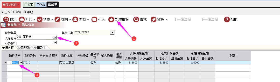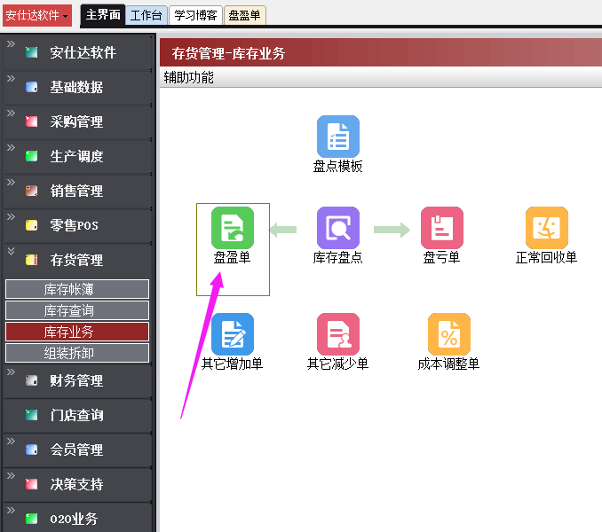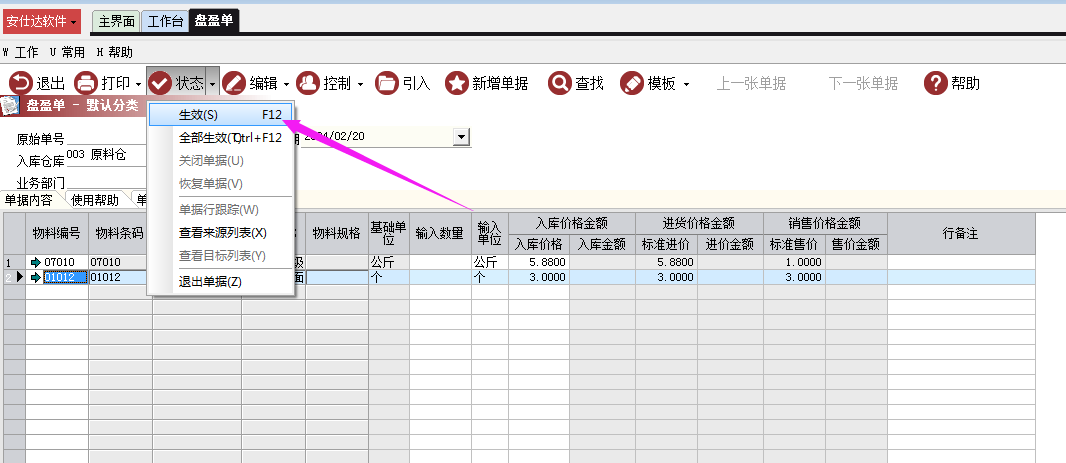 ①按照路径,存货管理->库存业务->盘盈单,打开盘盈单