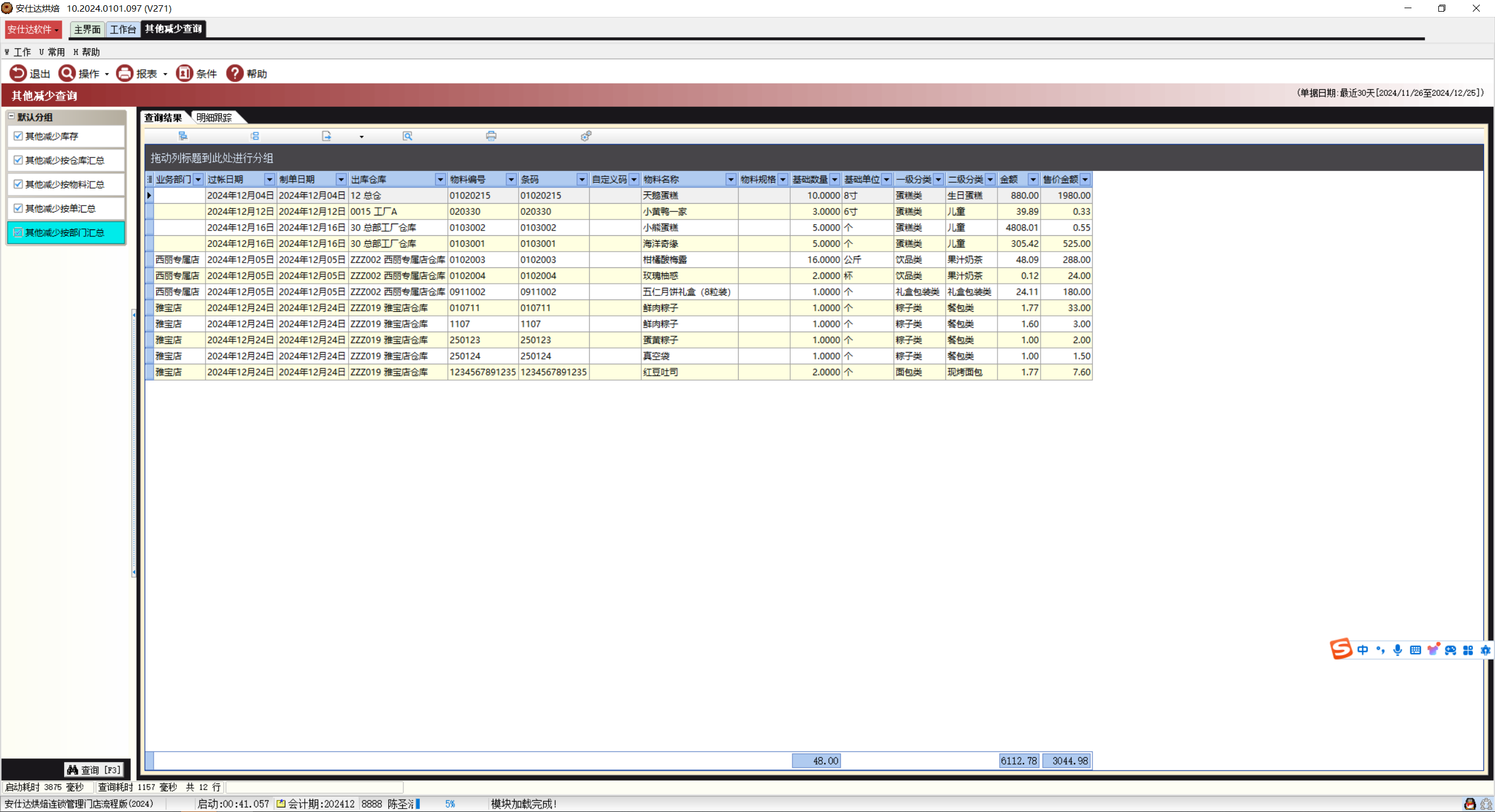 存货管理-库存业务-其他减少查询-其他减少按部门汇总