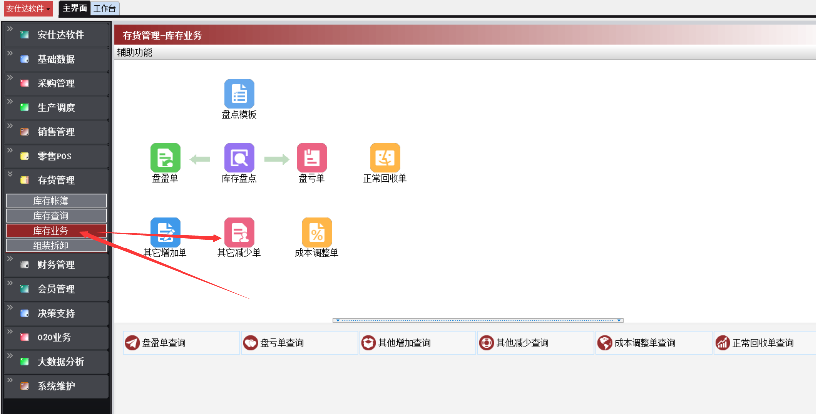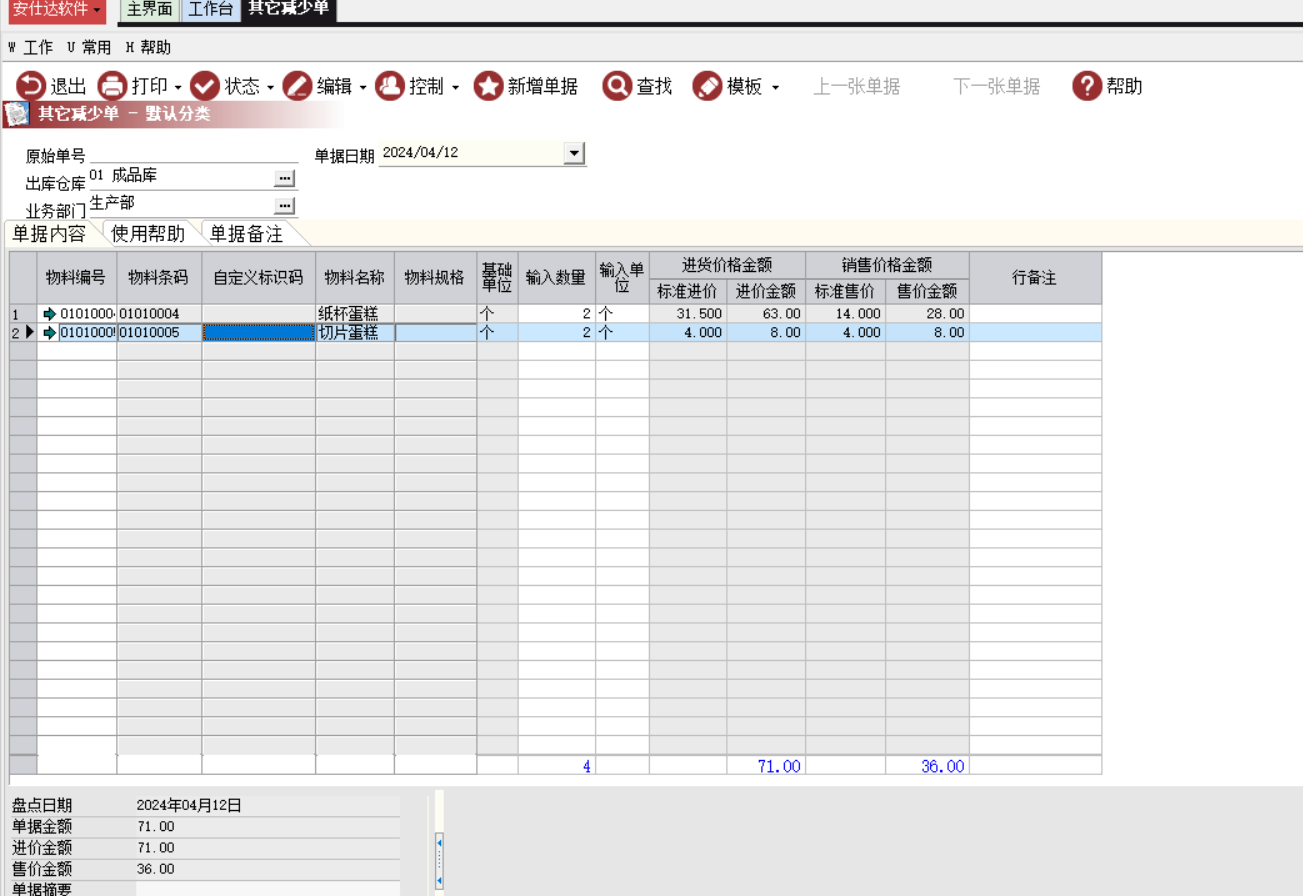 打开其他减少单,点击新增单据,选择出库仓库、业务部门,然后输入需要减少库存的产品和数量,最后生效即可