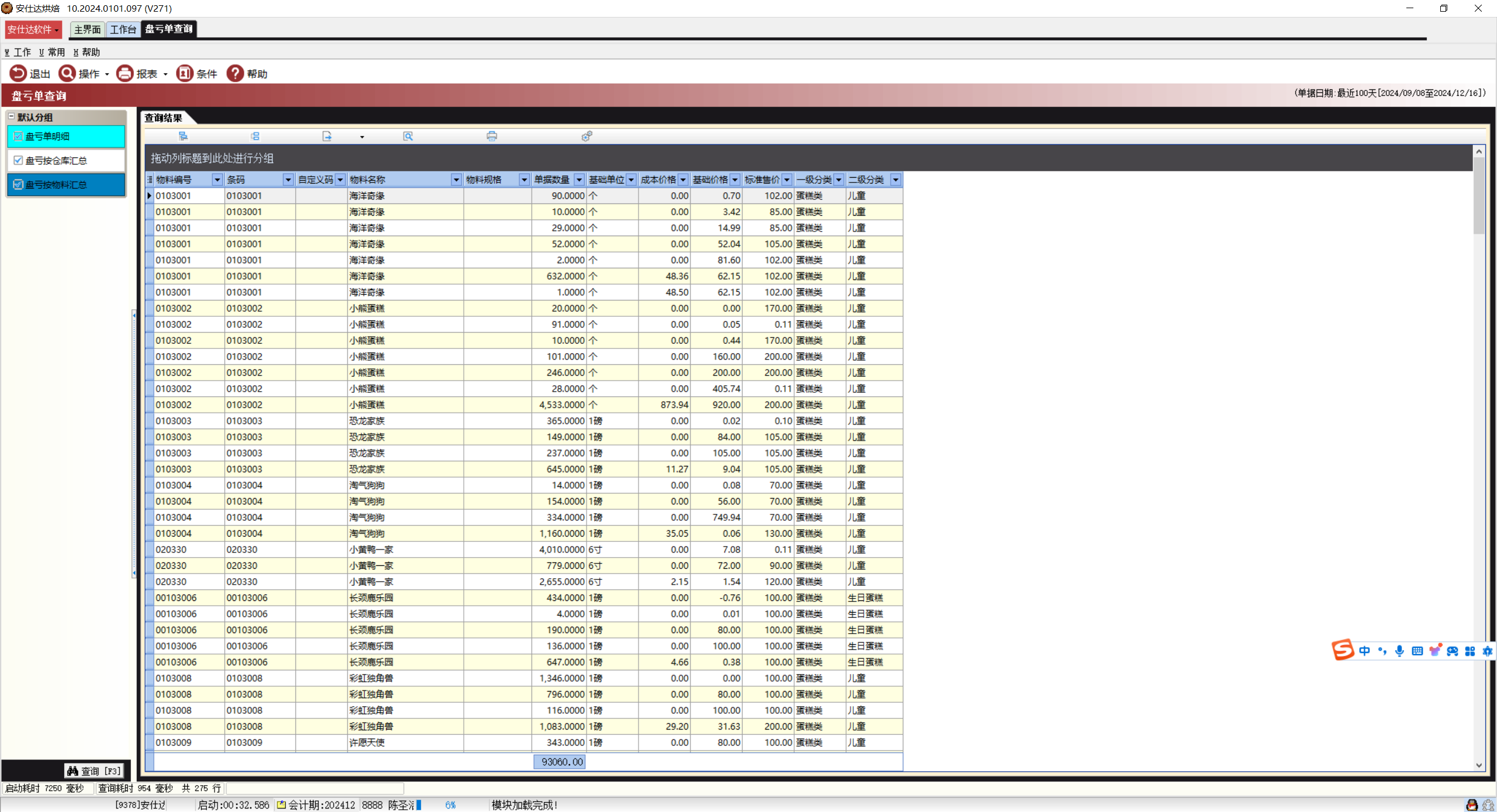 存货管理-库存业务-盘亏单查询-盘亏按物料汇总