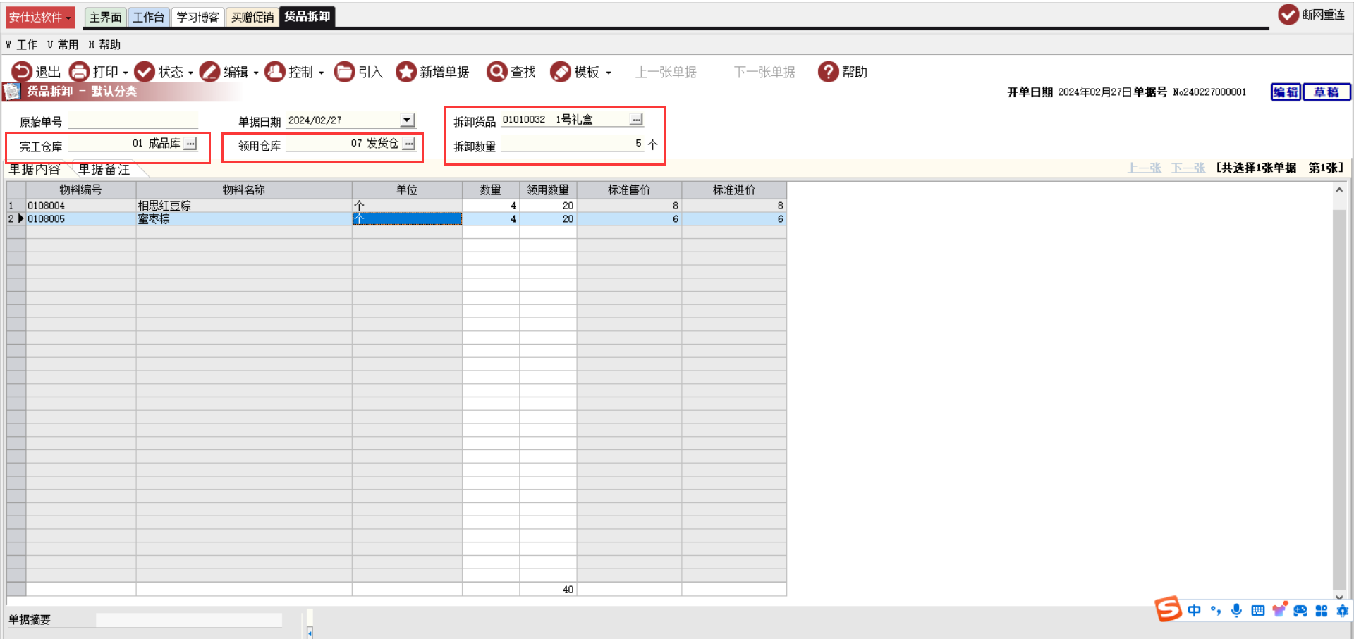 3,会自动出来拆开的子件产品和数量,最后生效单据即可