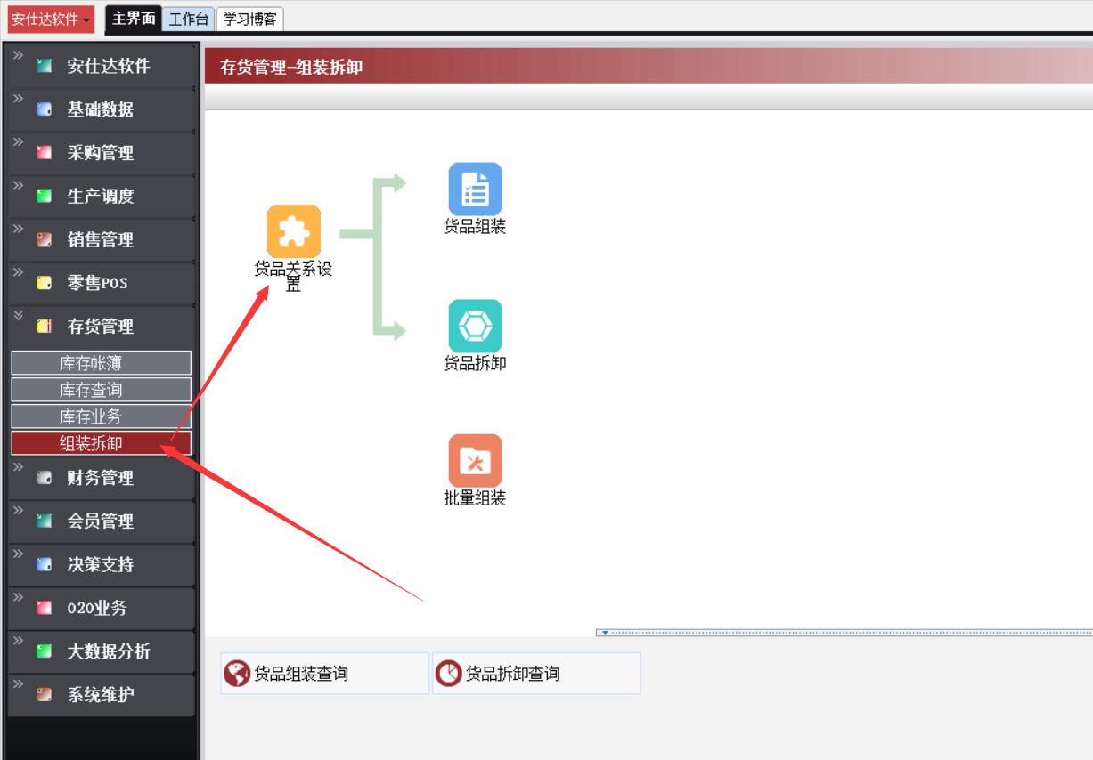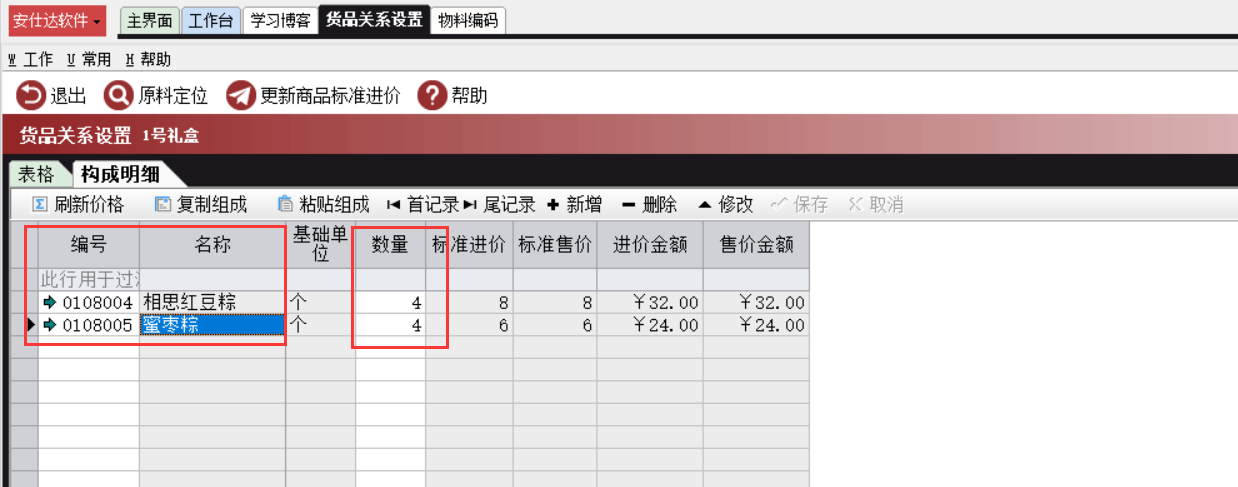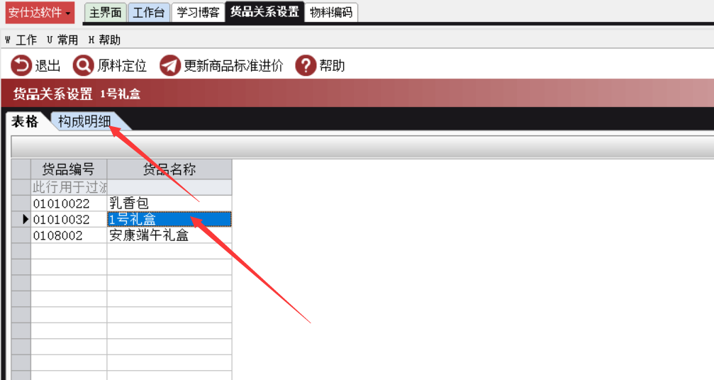 2,进入货品组装关系,选择对应产品,打开构成明细