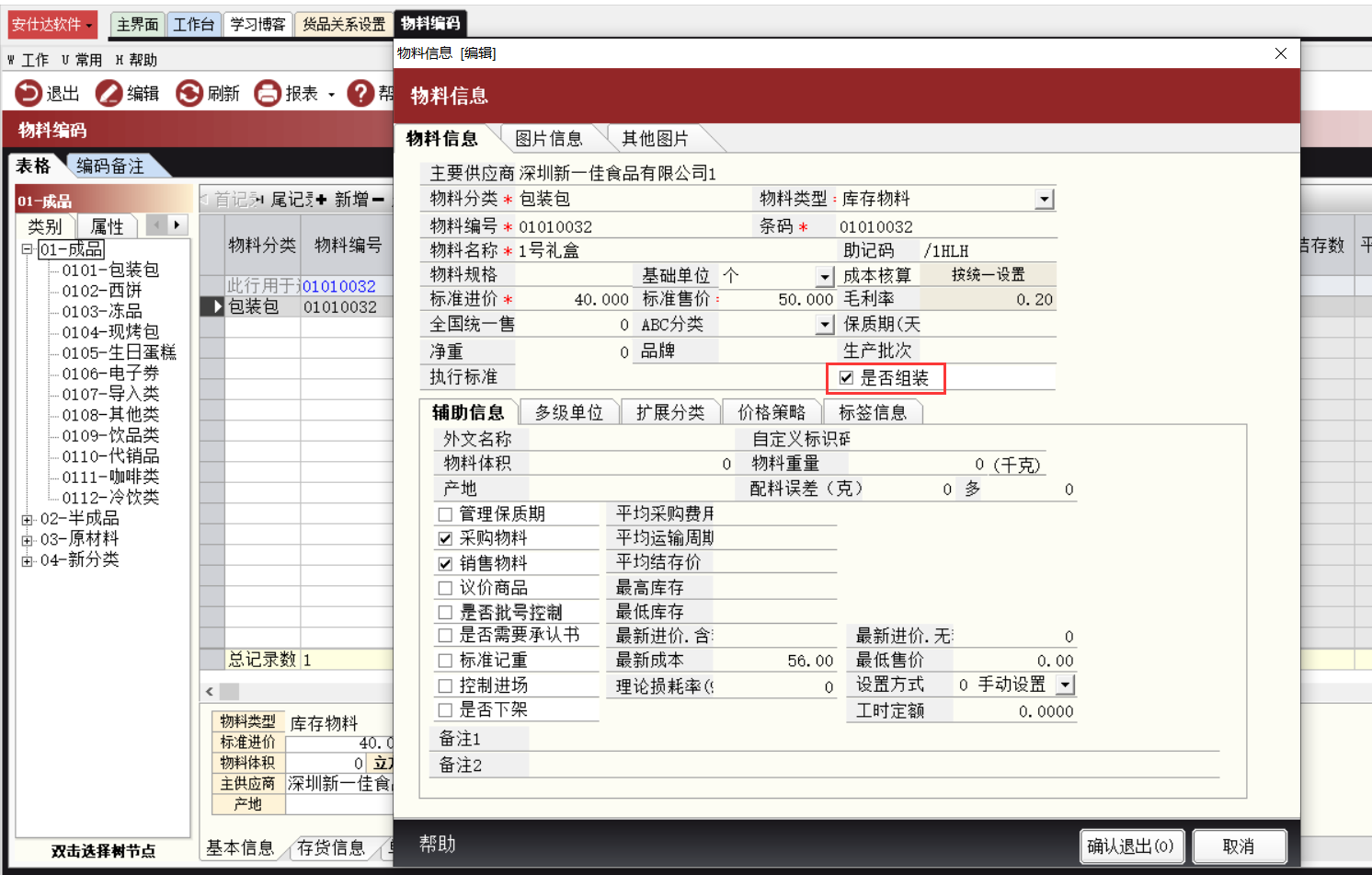 货品关系设置就是定义一个组装货品是由哪些子件商品组成,以及数量的多少。在定义组装货品前,先要定义在物料编码中定义组装货品,在物料编码信息中勾上是否组装。