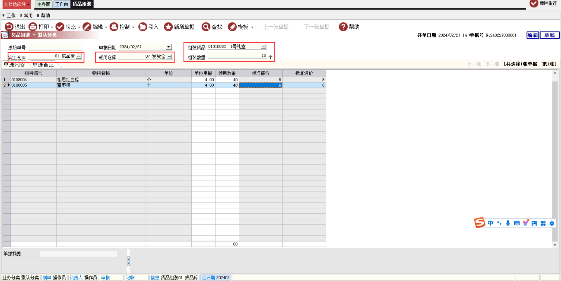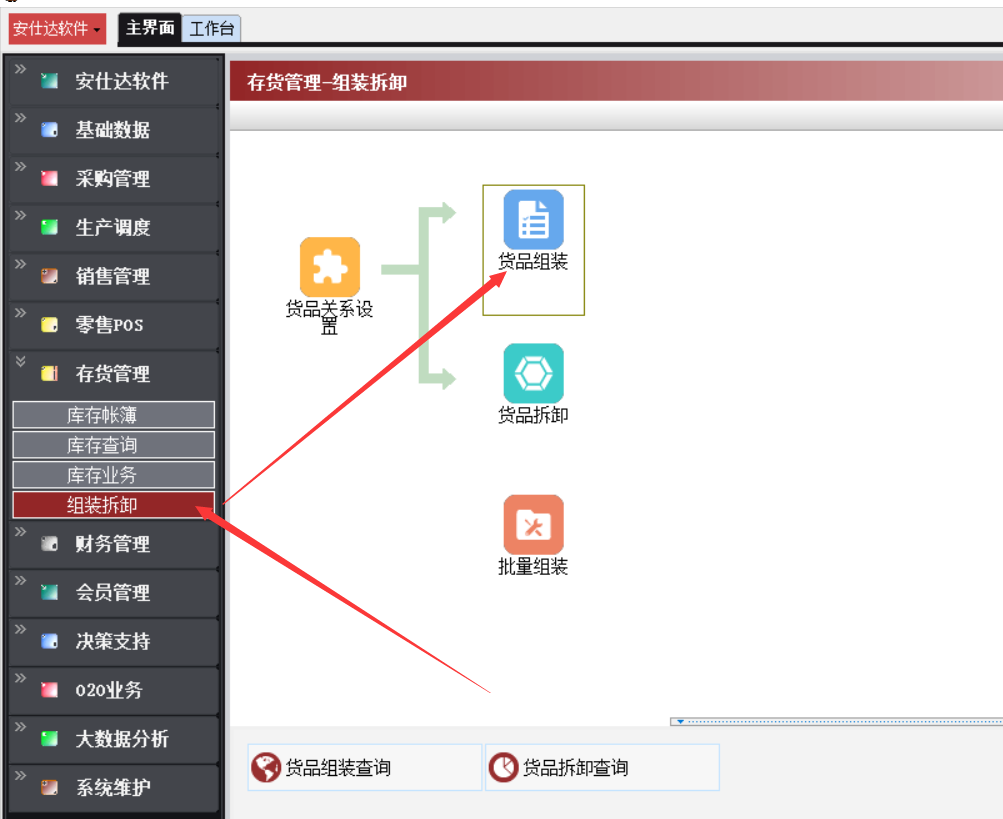 设置完货品组装的关系后,就可以进行货品的组装了,组装发生时,系统会减少被组装货品的库存数量,增加组装货品的数量。