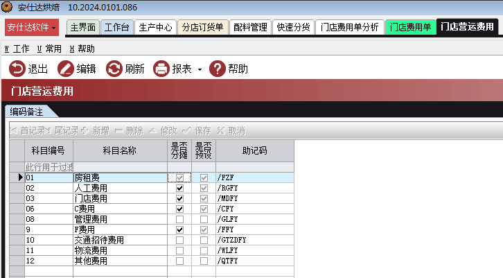 用于定义门店营业需要费用,支持设置是否分摊、是否预设