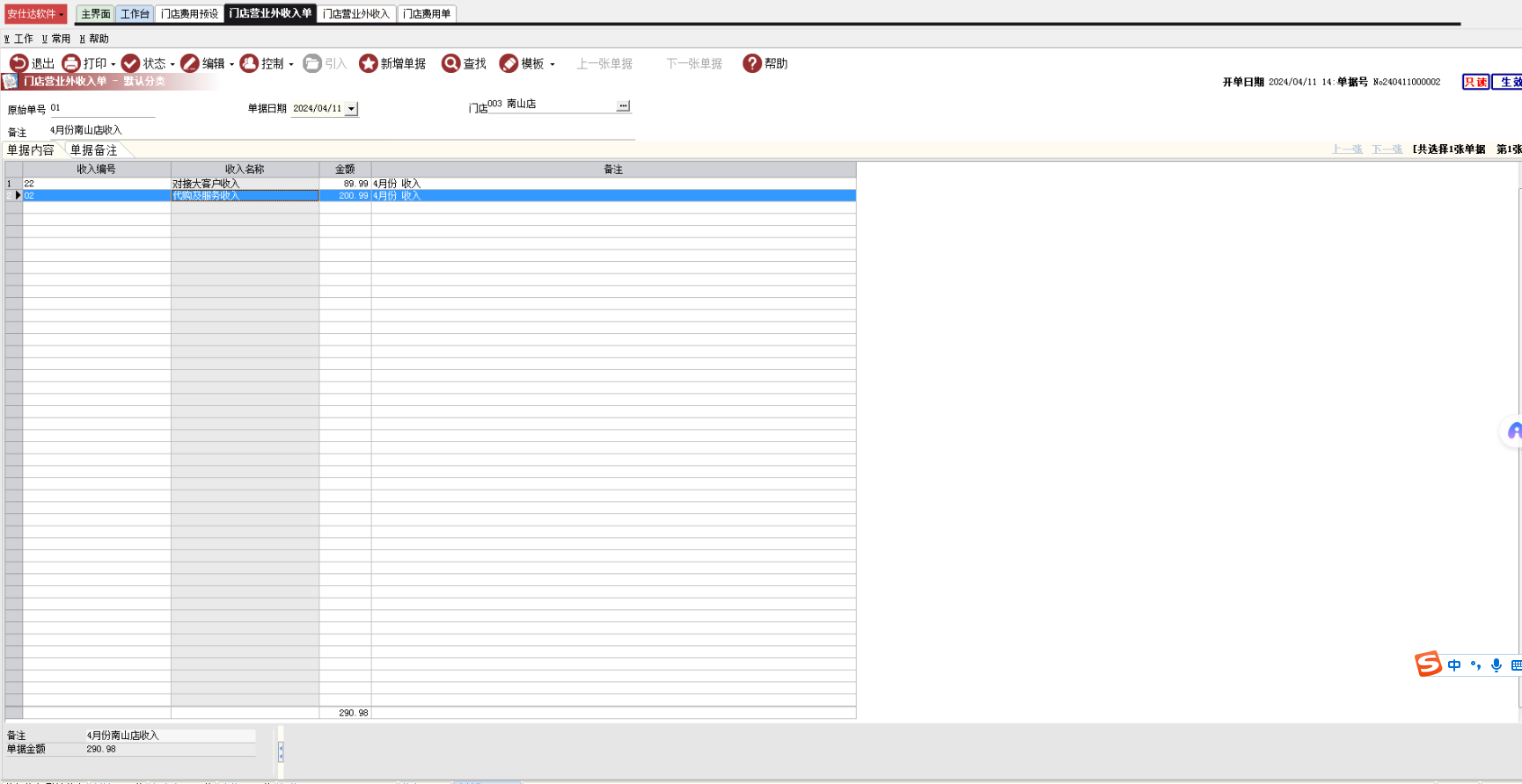 4、 营业外收入: 统计当前门店当前月份内门店额外收入单的汇总金额;