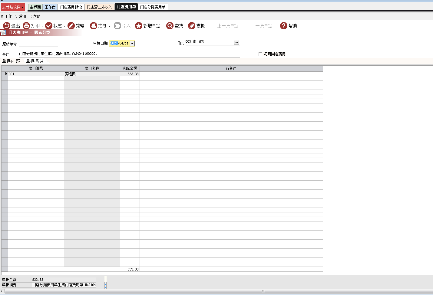 单据来源:自动生成门店分摊单、每月固定费用单、手动做的费用单