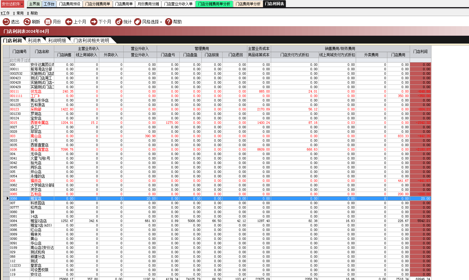 门店利润统计公式 : 零售收入+线上收入+外卖收入+ 营业外收入+门店盘盈-零售费用- 线上费用- 外卖费用- 销售成本-门店费用-门店退回-门店报废- 门店盘亏