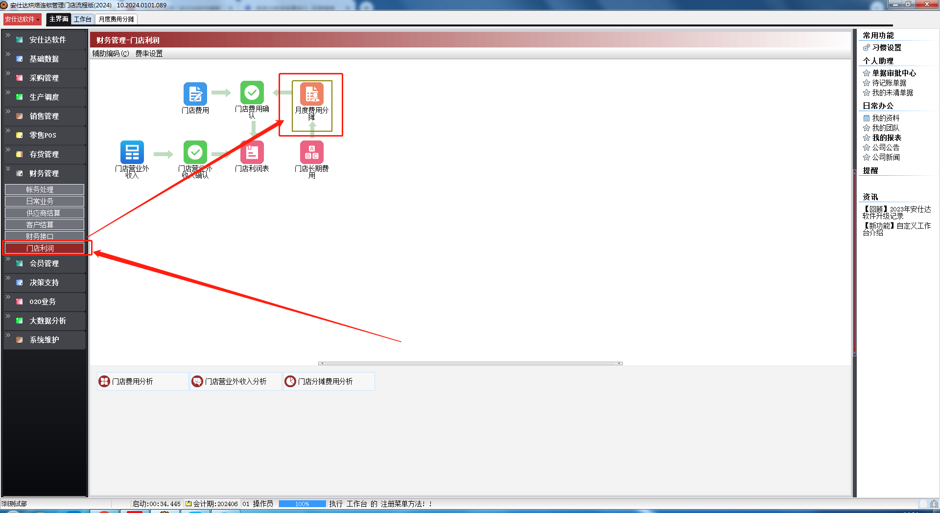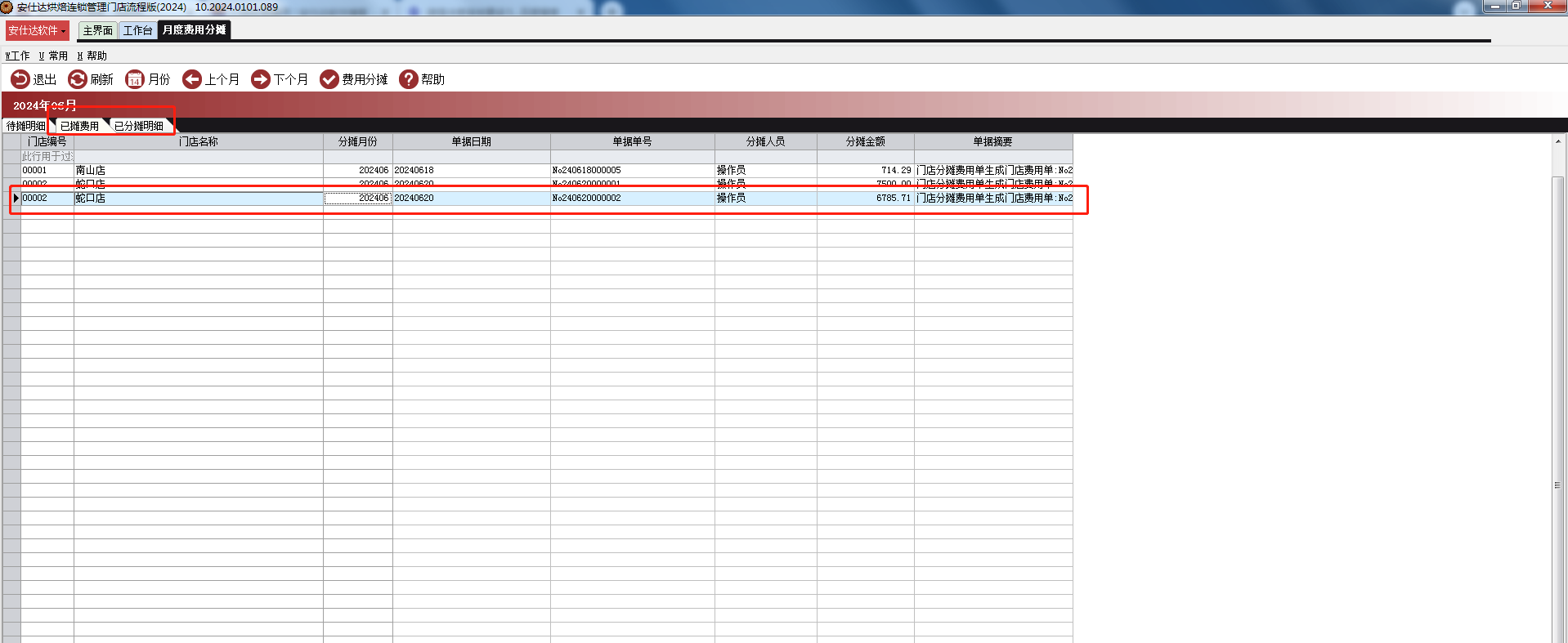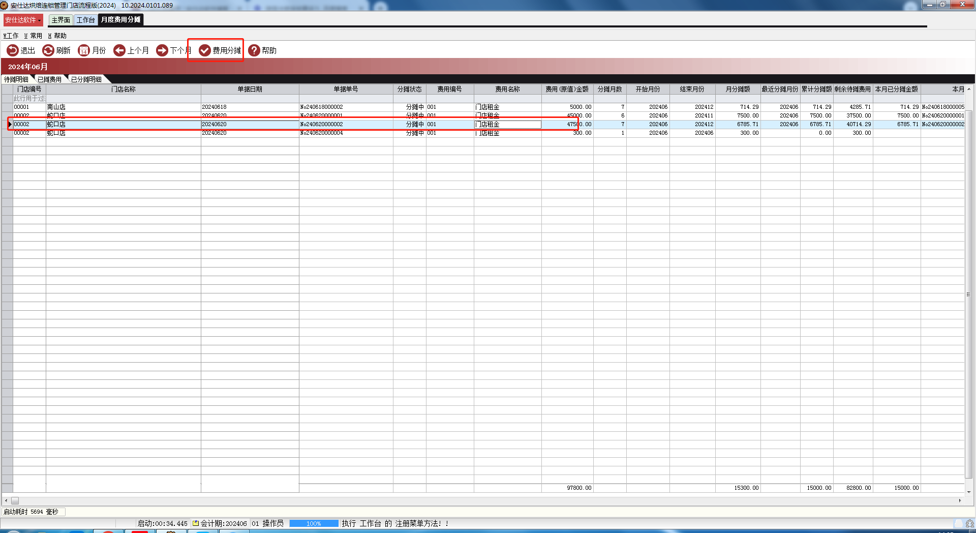 1、选中一项费用,对本月或者所选的月份,确认分摊金额(如:六月分摊:6785.71)