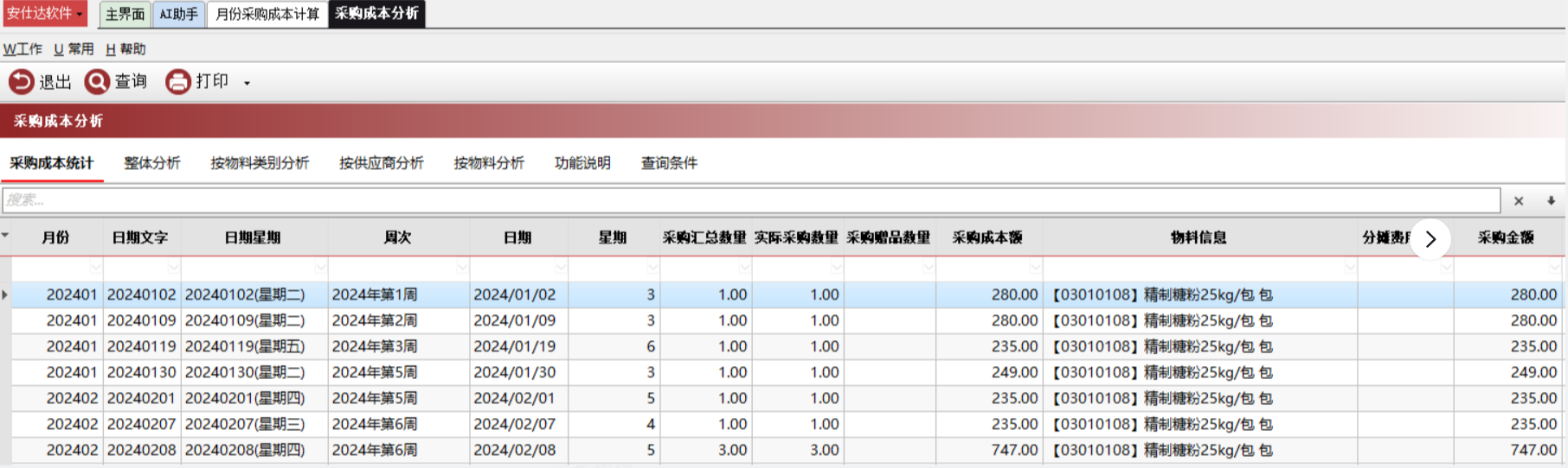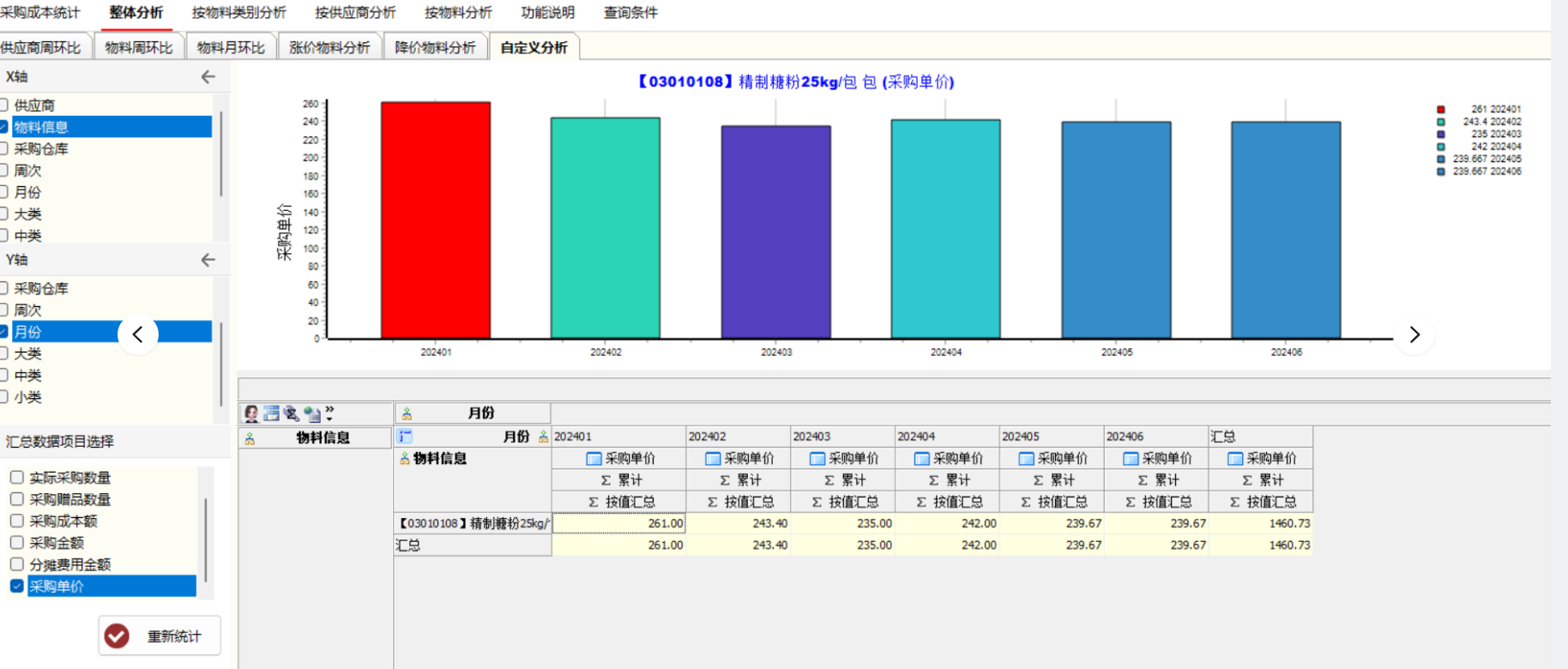 效果:举例,这里单独统计精制白糖这半年的采购单价。