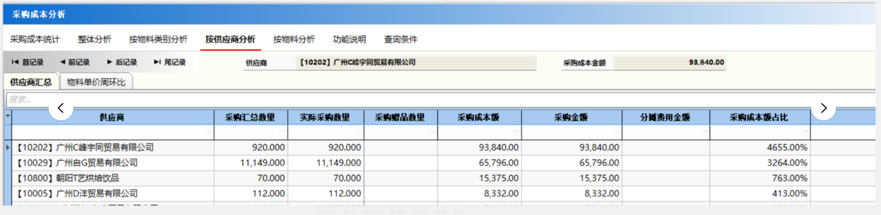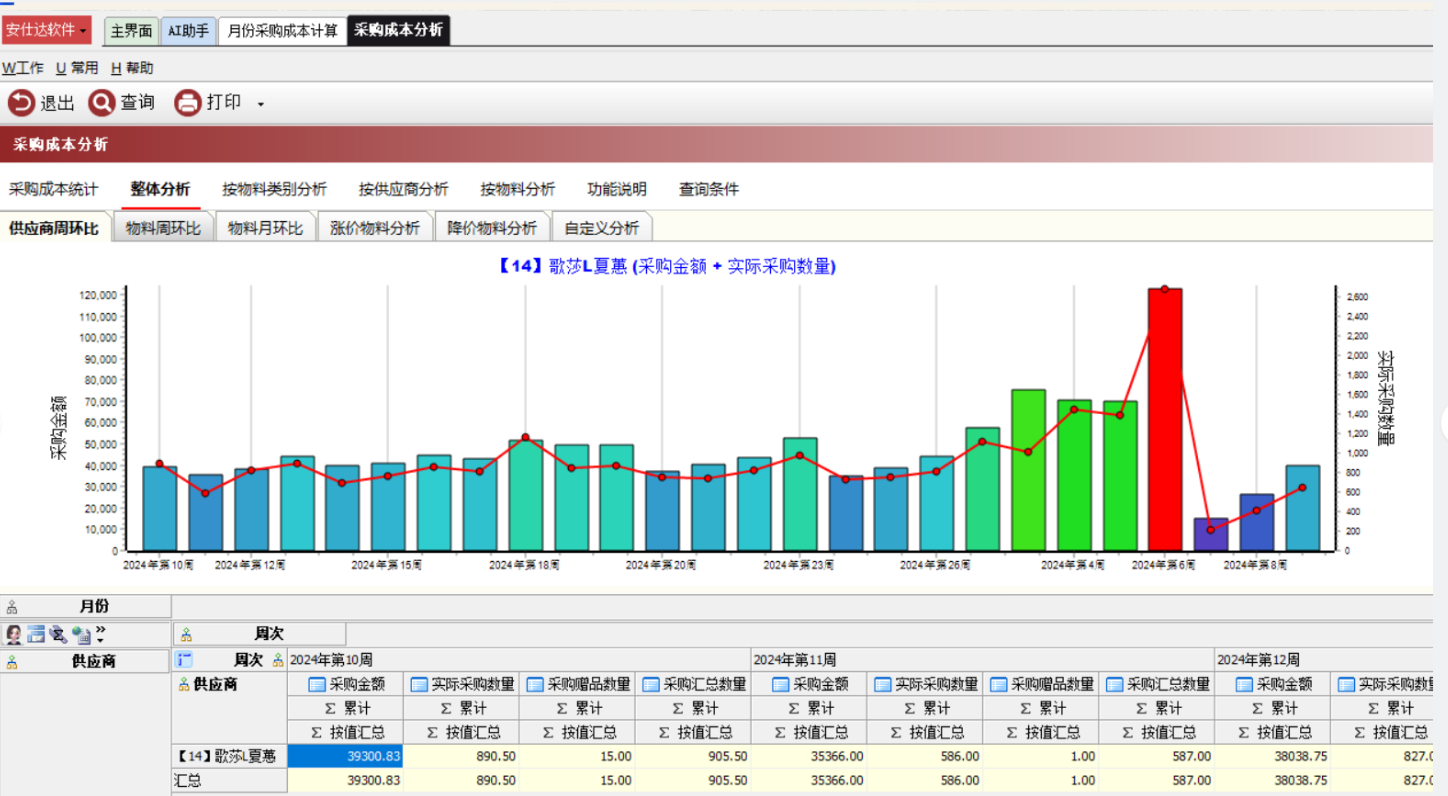 作用:统计各个供应商周期内的采购数量,采购金额和采购成本