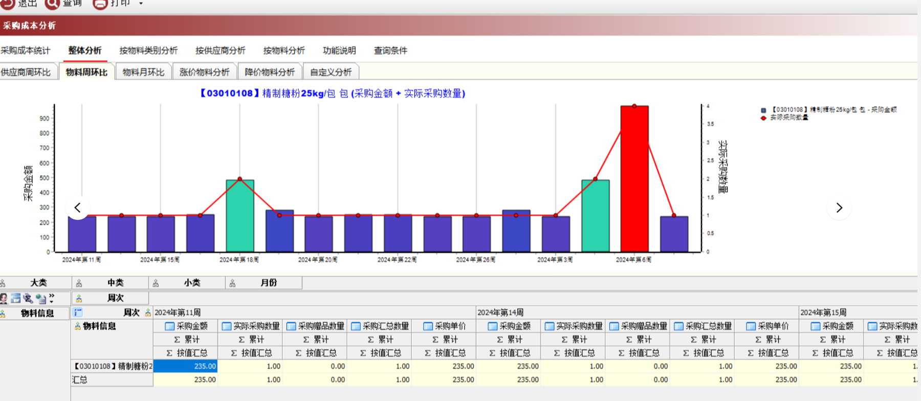 作用:统计指定仓库,指定物料每周的进货数量和进点货金额