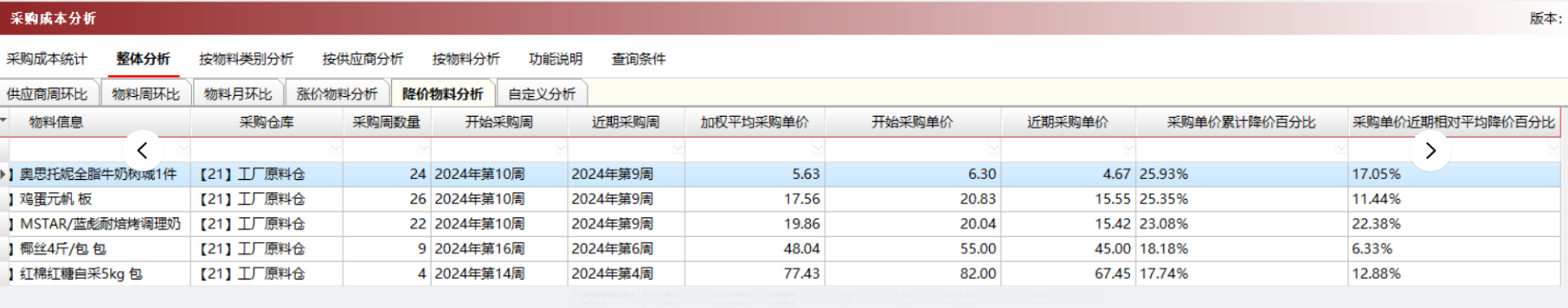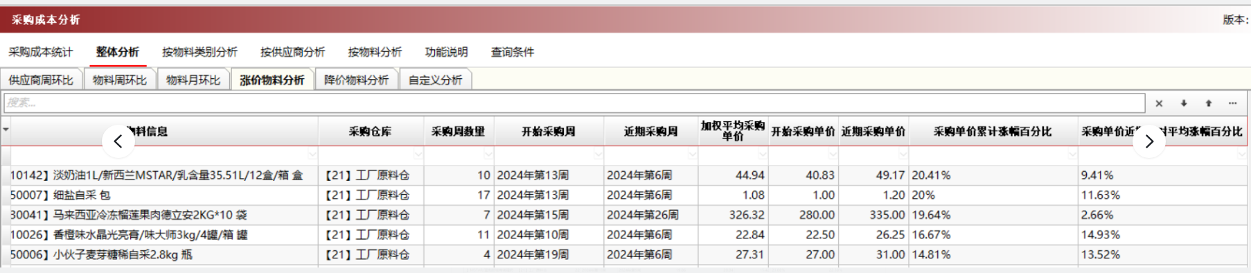 包括:供应商周环比,物料周环比,物料月环比,涨价物料分析,降价物料分析,自定义分析