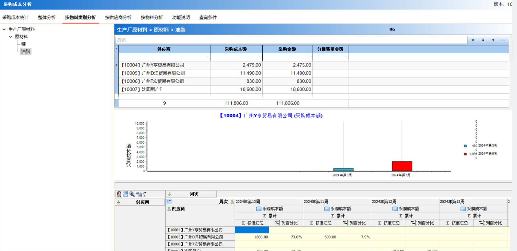 作用:统计单个产品在指定周期内,在不同供应商的采购数量和采购进的。