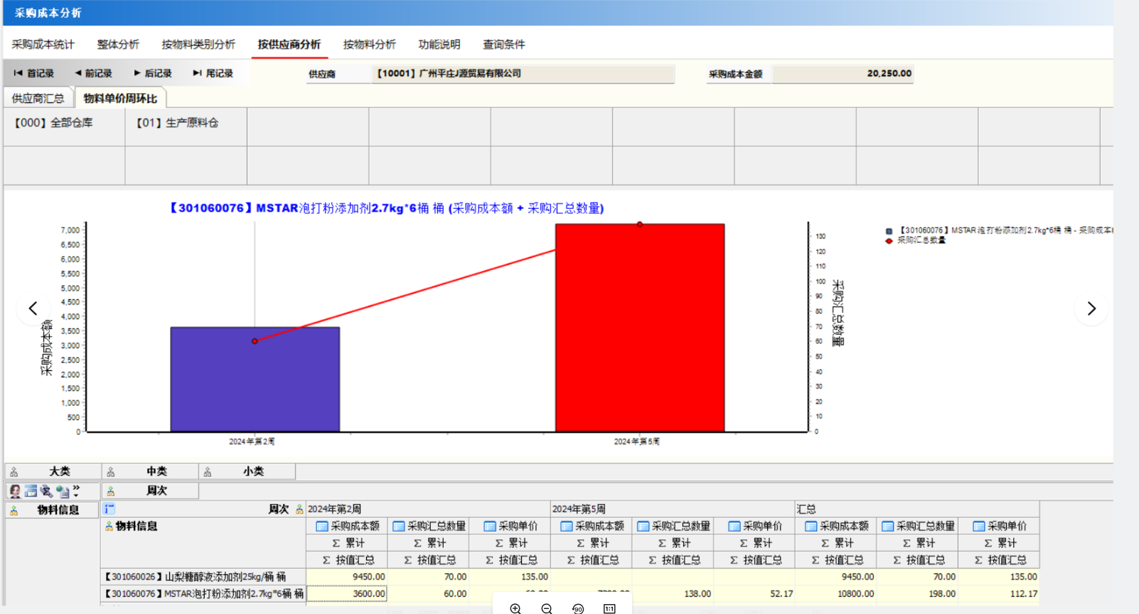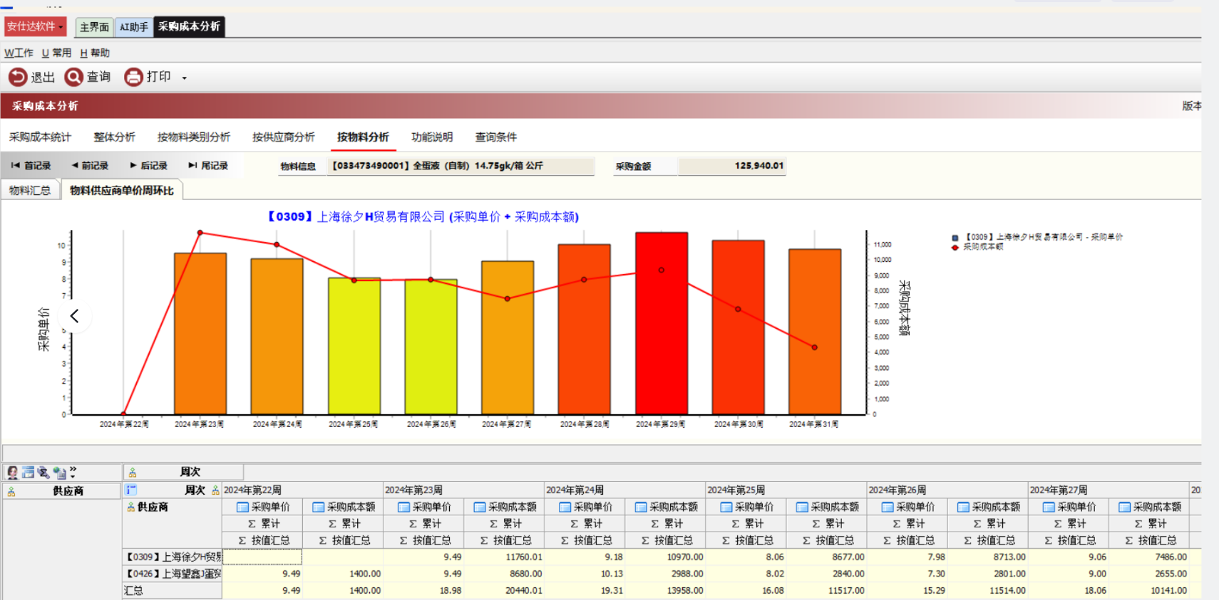 作用:图表化体现单个产品在指定周期内,在不同供应商每周的采购单价和采购成本。