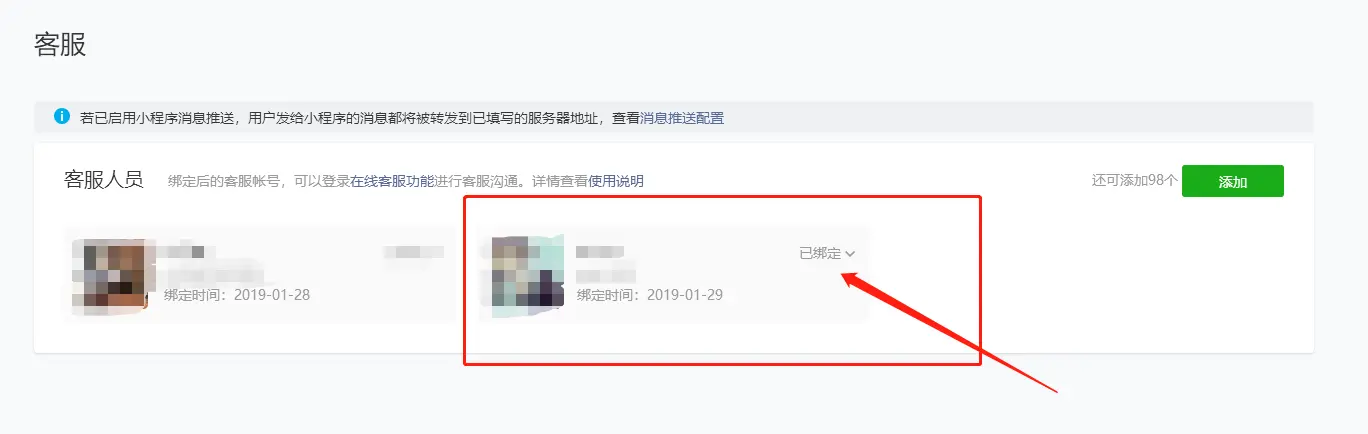 ②点击【客服】,进入客服设置界面,点击【添加】,添加客服人员微信号,确定后就显示【已绑定】