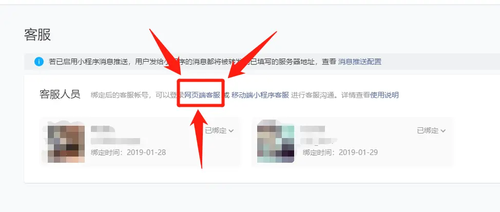 (1)小程序客服入口有两个:小程序后台网页端客服、移动端小程序客服(使用移动端小程序客服前需先在网页后台绑定客服人员),