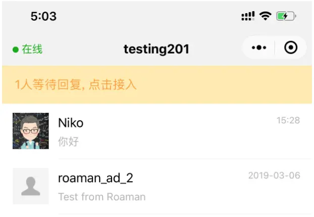 ③首次打开小程序后,会自动接入客服消息,后续有新的客服消息,可点击顶部接入栏进行接入; 已经接入的会话,客服人员可以在48小时内和用户进行对话,目前支持发送文本、图片类型的消息。