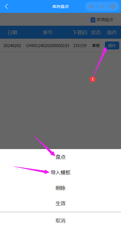 ②点击操作,如果直接点击盘点,则只能通过扫码添加盘点产品,如果点击导入模板,则可以导入盘点模板里面的产品进行盘点。