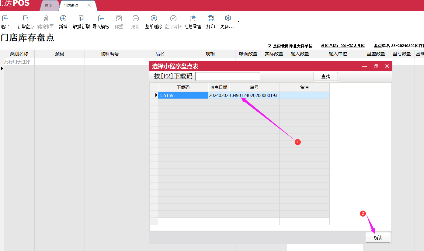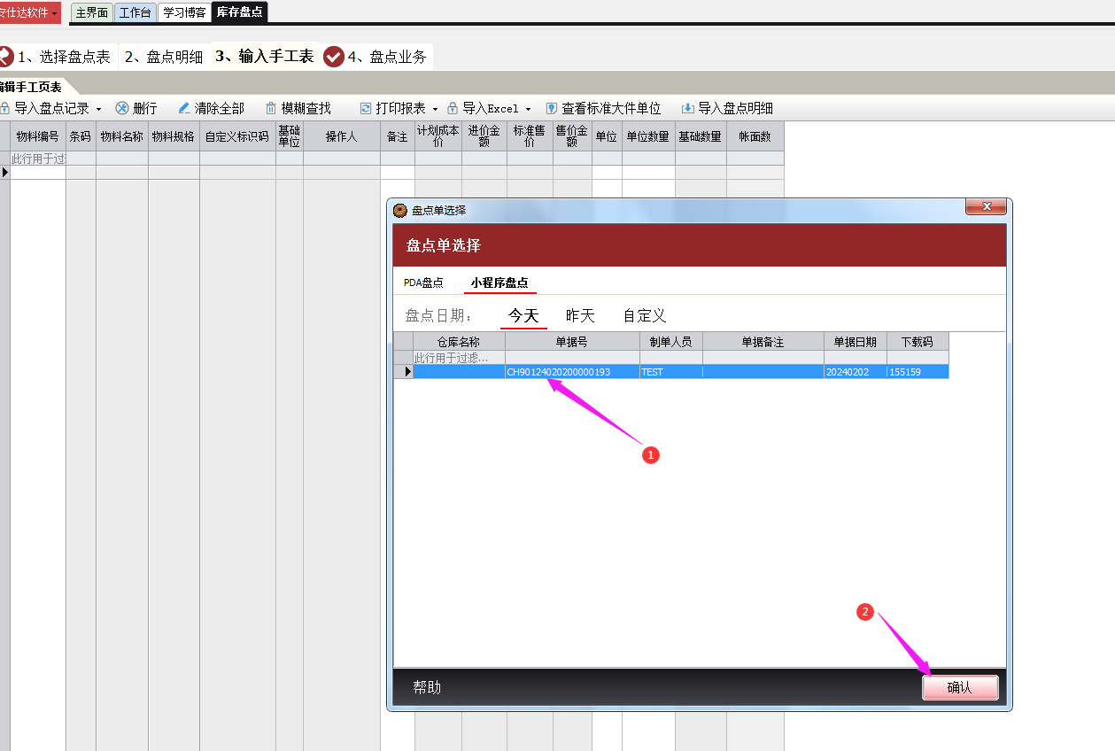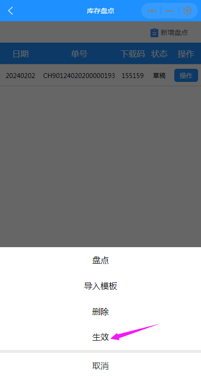 ②选择需要导入的盘点小程序单,点击确认,就可以直接生效盘点单了