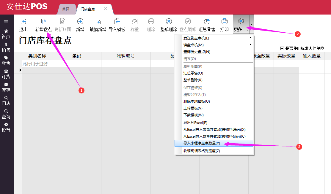 ①在前台门店库存盘点,点击新增盘点后,点击更多,点击【导入小程序盘点数量】