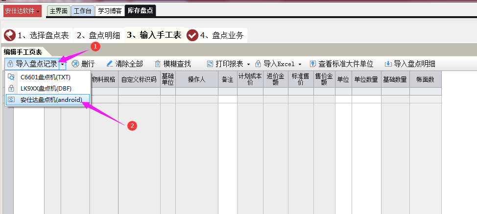 ①后台新增好盘点单,到达第三步【输入手工表】页面,点击导入盘点记录,点击【安仕达盘点机】