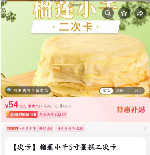 计次券也可以理解为“量贩特价”,分次可以增加复购,产品这块大部分客户会搞一些西点和小尺寸蛋糕产品。